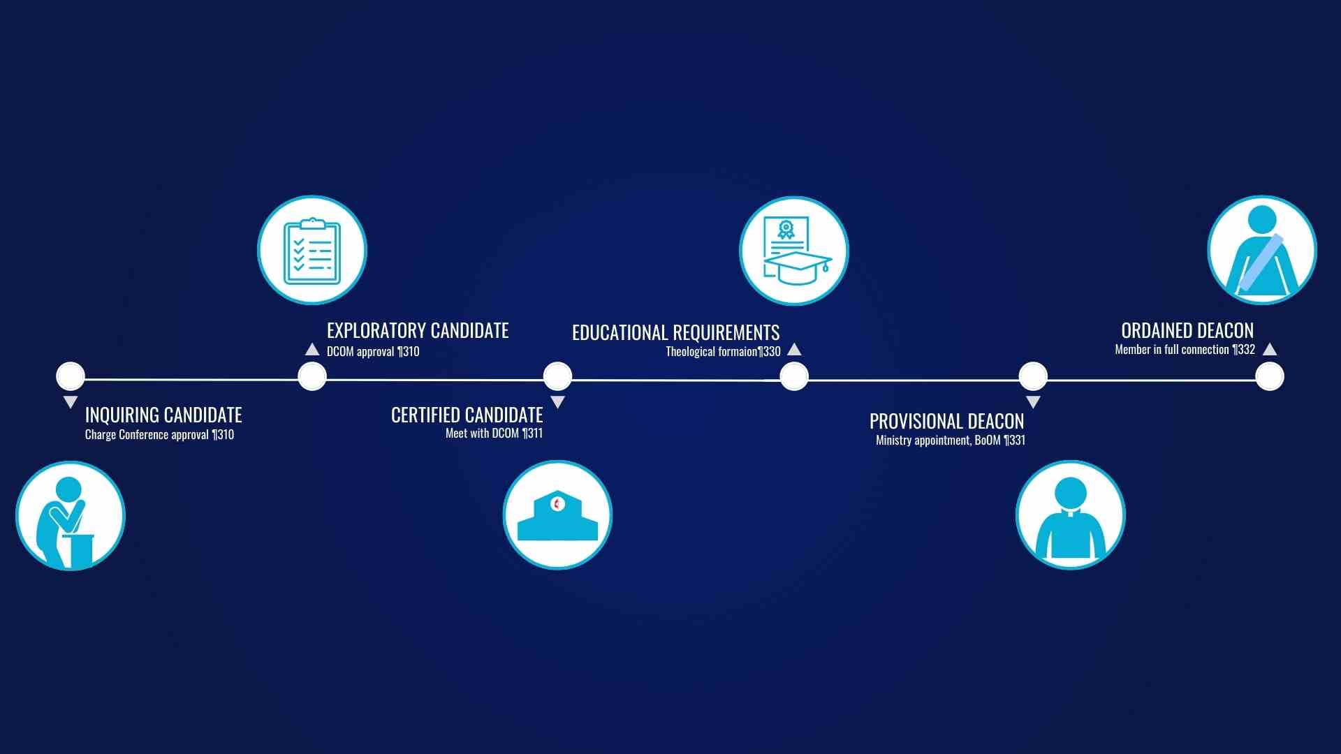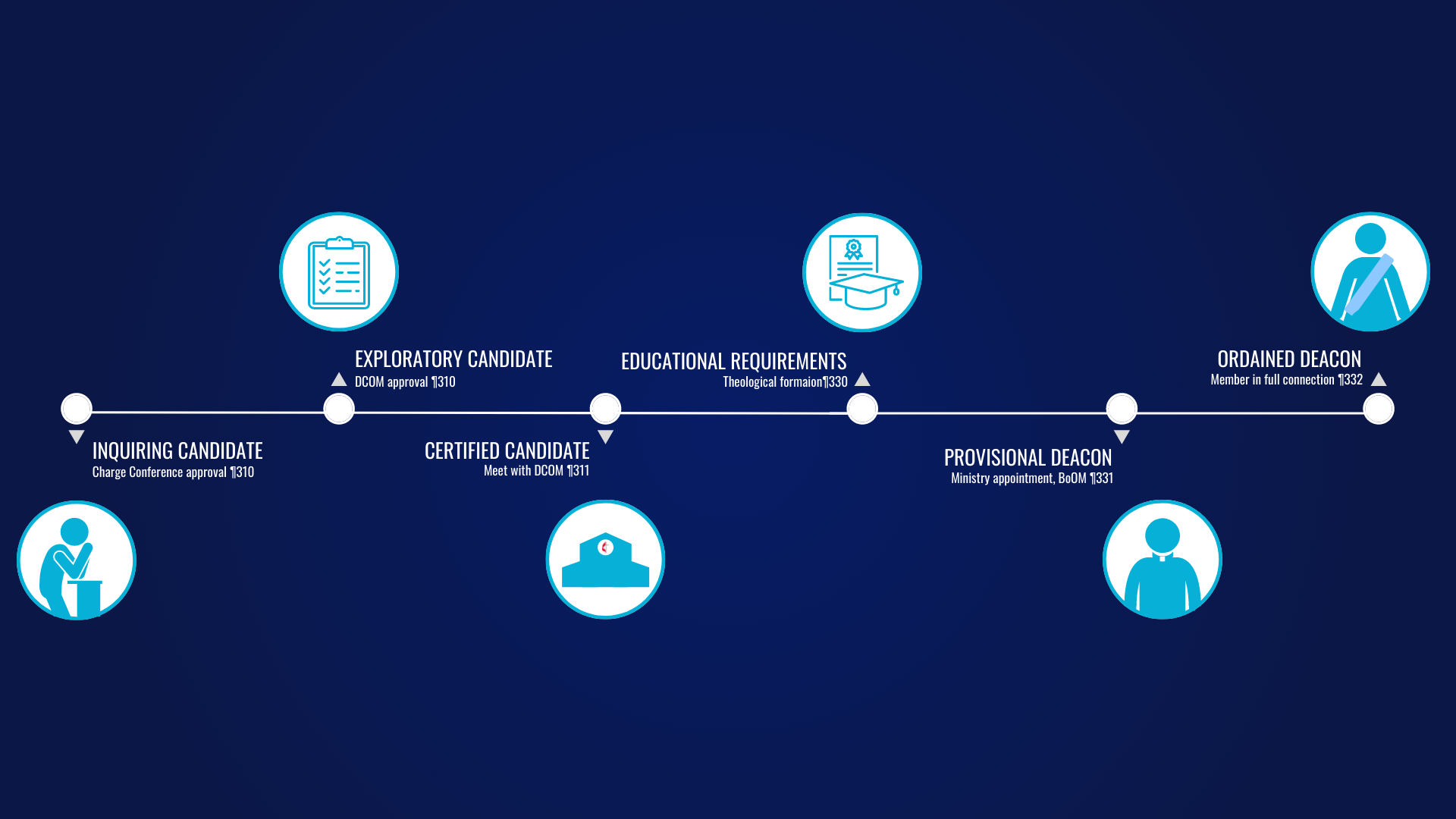 The steps outlined in this video are the basic standards established by the General Board of Higher Education and Ministry and can be found in paragraphs 310 - 314 and 328 - 331 in the Book of Discipline of The United Methodist Church. However, each Annual Conference has the authority to require additional steps to contextualize your preparation and formation. So be sure to check in with your Pastor, District Superintendent, mentor or Board of Ordained Ministry to ensure you are meeting your conference’s requirements.