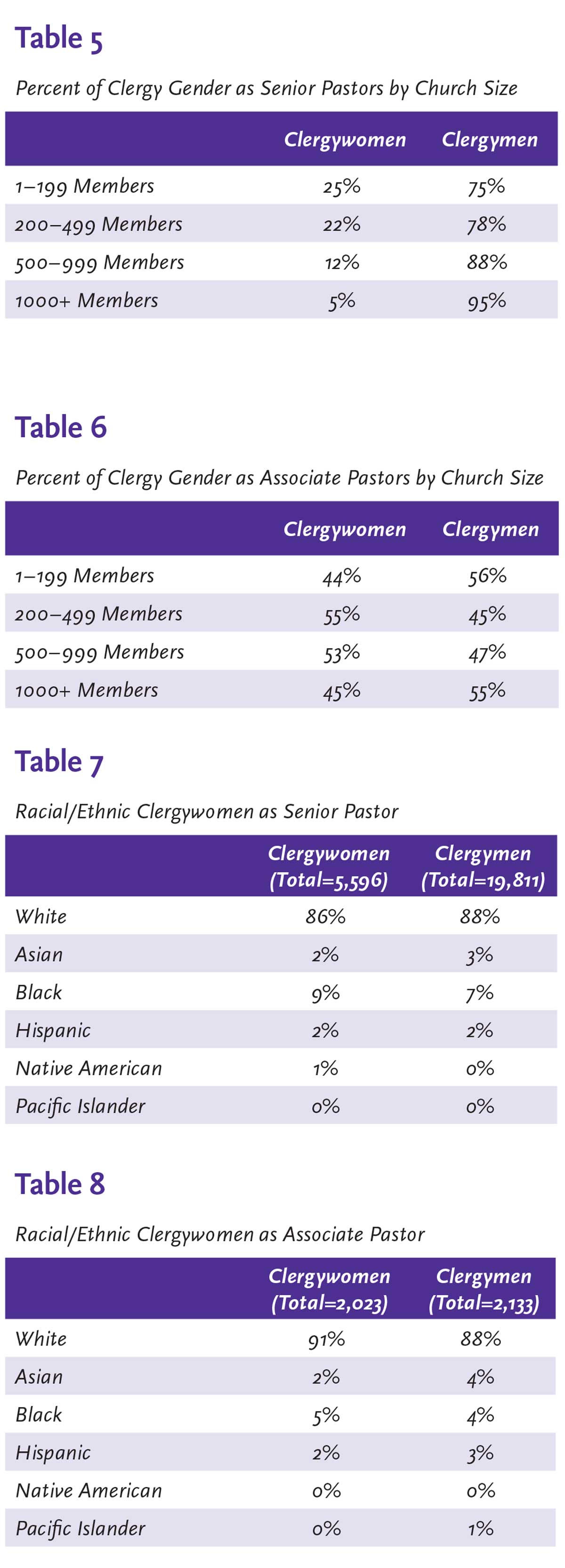 When the data are analyzed for senior pastors and associate pastors, the numbers are not at all kind to racial/ethnic clergywomen. Only African-American clergywomen show somewhat respectable numbers, but in both roles—senior pastor or associate pastor— the percentages are less than 10% (see Tables 7 and 8).