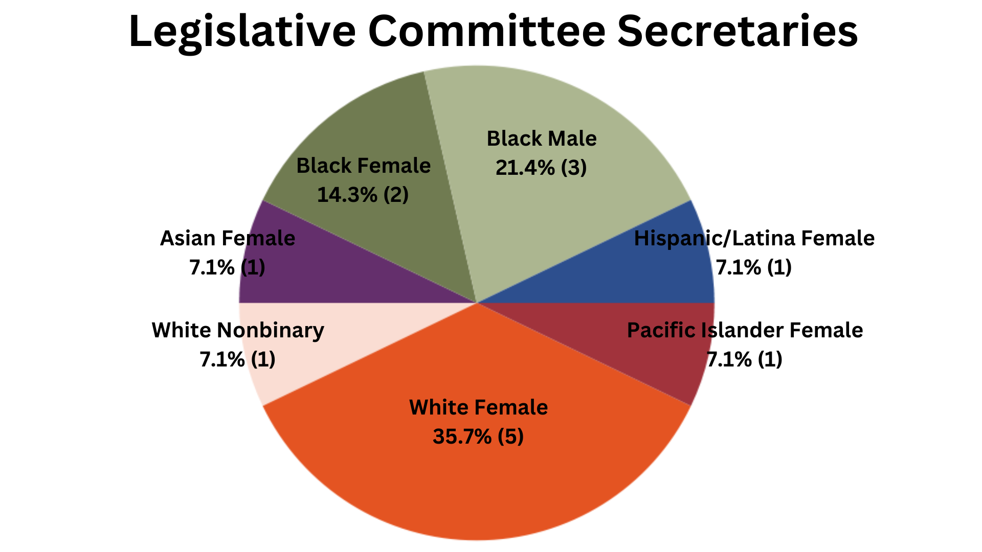 Secretaries: 1 Asian Female, 2 Black Females, 3 Black Males, 1 Hispanic/Latina Female, 1 Pacific Islander Female, 5 White Females, 1 White Nonbinary.