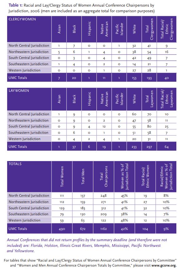 Overall, each of the five U.S. jurisdictions has shown a steady increase in the number of women serving as presidents or chairpersons of missional and administrative committees, according to data compiled from the “Annual Conference Committee Chairpersons Profile 2006,” collected by the General Commission on Religion and Race and GCSRW.