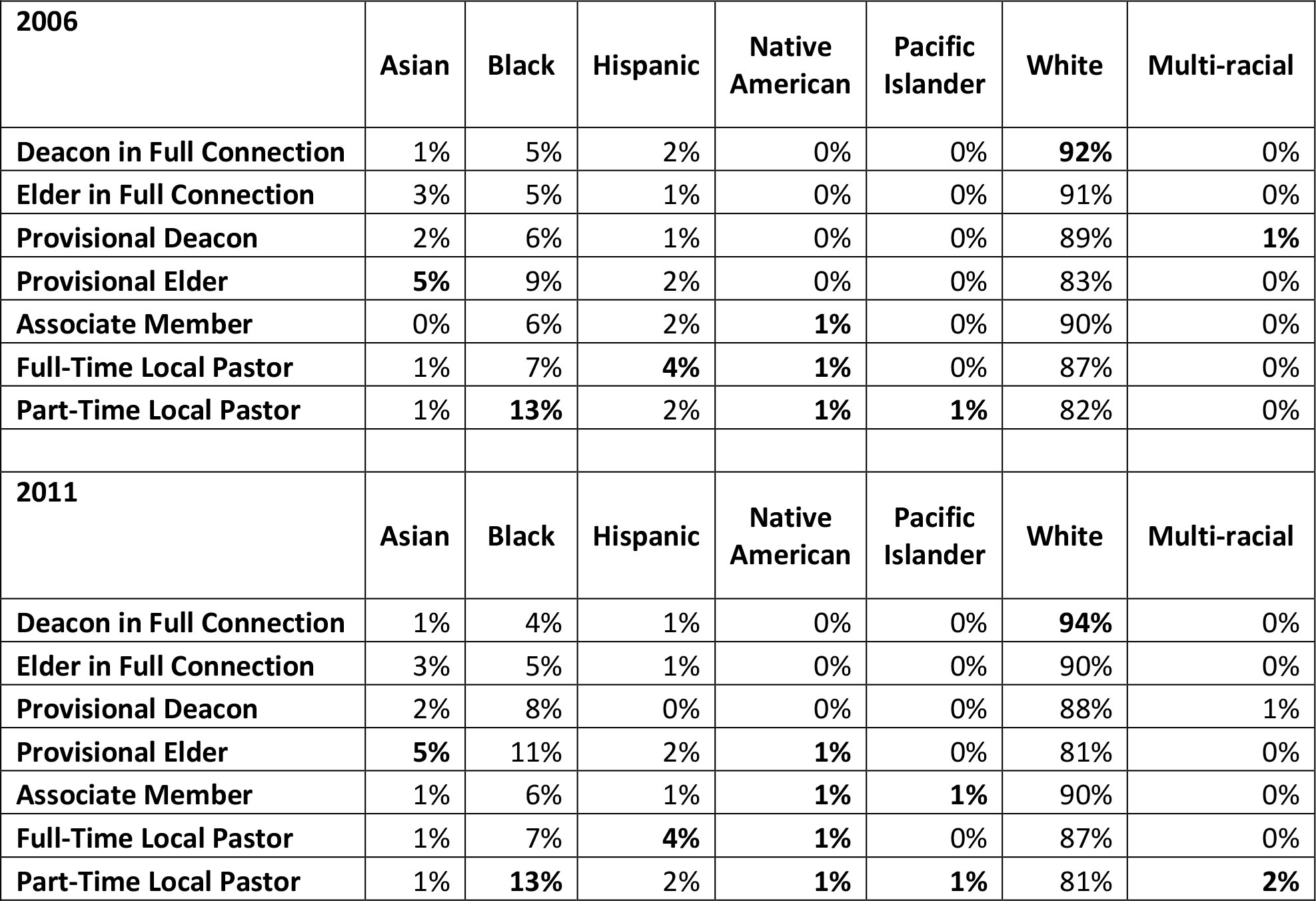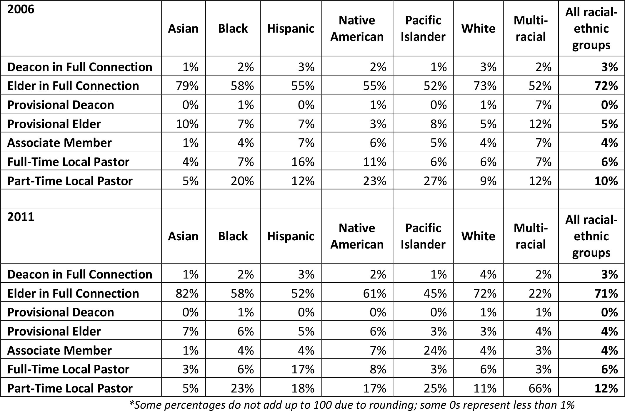Table 1 below shows what percent of each racial-ethnic group are ordained in which clergy positions. (For example, 1% of the Asian clergy are Deacons in Full Connection, and 79 percent of Asian clergy are Elders in Full Connection).
