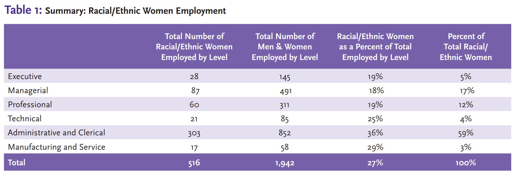 The number of racial/ethnic women employed across the general agencies of the church is low. With the exception of the administrative and clerical (36%), technical (24%), and manufacturing (29%) categories, racial/ethnic women comprise 20% or less of the total number of persons employed for each category (see Table 1).