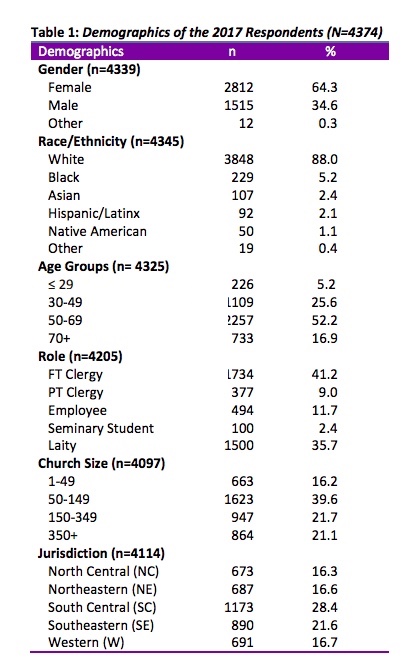 Previous surveys were limited, as they had to be completed on paper and collected through the mail. Last year, the survey was distributed via the internet to two major samples. One list was a random sample of 500 clergy and 500 laity from various positions of leadership as listed in Annual Conference Journals and/or on Annual Conference websites, in numbers proportional to their representation at the General Conference. In addition, leaders of various constituencies were contacted and asked to distribute the survey. This included Conference Communications Directors, the Council of Bishops, Chancellors, Cabinets, Assistants to the Bishop, Staff Parish Relations Committee Chairpersons, Lay Servants and Lay Leaders, Boards of Ordained Ministries, Trustees, Missionaries, Children/Youth Ministers, Deaconesses and Home Missioners, Camp Directors, Safe Sanctuaries Leaders, Annual Conference Human Resource Contacts, and United Methodist Seminaries and Licensing Schools. Because the purpose of the survey was partly comparative, the data for all three surveys (1990, 2005 and 2017) were collected from participants in the United States only. We hope to begin to study sexual misconduct in the Central Conferences in the upcoming year. In the end, 4374 people completed all or most of the survey.
