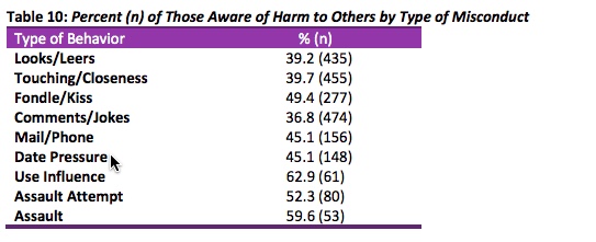 Most respondents (53.6%) said they were not aware of their perpetrator harming anyone else, but almost one-third (32%) said they knew of others, while the remainder (14.4%) were unsure. Those experiencing some of the most severe forms of sexual misconduct were the most likely to know of others being harmed. This, of course, is alarming, in that the worst offenders are not committing isolated incidents. The percentages of those who said they knew or suspected harm to others based on the type of behavior is shown in Table 10.