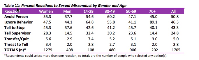 The most common response to sexual misconduct is to avoid the person (50.8%) or ignore the behavior (46.3%), although there is some difference by gender and age, with women more likely than men to 8 avoid the person and older and younger people more likely than middle-aged respondents, to ignore the behavior, as seen in Table 11. Also notable is that women and younger respondents are more likely than others to tell a supervisor, request a transfer, or quit.