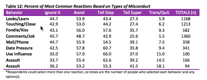 Responses also differ a bit depending on the exact behavior. Most notably, the response of telling someone to stop is more likely than avoidance or ignoring for the more serious incidents, as seen in Table 12. In addition, the more serious incidents are more likely to lead to a report to one’s supervisor or a request to transfer or quitting.