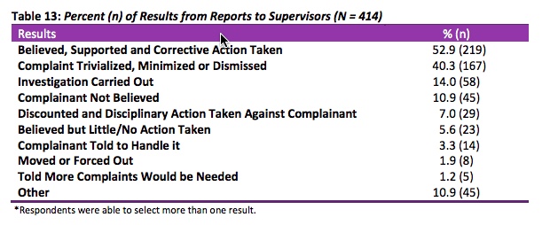 For those who made a formal report to a supervisor, the most common reaction was that they were believed, supported and corrective action was taken (52.9%), but that was closely followed by the second most common result, which was that the complaint was minimized, trivialized or dismissed (40.3%). All responses appear in Table 13. Note that quite a few respondents who made such a report to a supervisor selected “other” (n = 95; 22.9%), and a full quarter of them (n = 23) wrote in that they were believed, as in the most common response, but that very little or nothing was done. Another 27 of the “other” respondents (6.4% of those reporting to a supervisor) wrote in negative reactions, including being told to handle it themselves (n = 14; 3.3%), being moved or forced out (n = 8; 1.9%), or told that more than one complaint would be necessary to make a case (n = 5; 1.2%). In one case, the complainant was told she needed a letter from a counselor to show that she was a credible accuser.