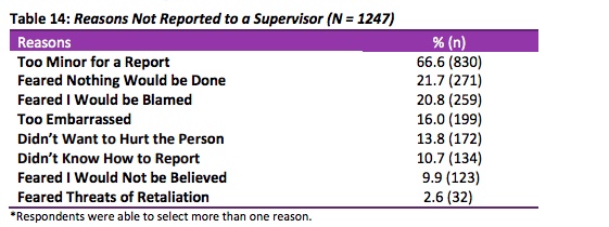 As for those who did not report, the most common reason was that the respondent thought the behavior was insignificant and therefore not worthy of a complaint (n = 830; 66.6%). All of the reasons for not making complaints appear in Table 14.