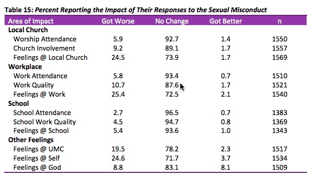 Of the 1667 respondents who reported on the results of their responses (including all responses – not only those making formal complaints), almost half (43.5%) felt that things got better overall. About one quarter (25.2%) said there was little change, and for 61 people (3.7%), things got worse. The remaining quarter (27.7%) said they were either unsure of the results, or their experiences were multiple and the results varied. The specific areas of their lives that got better or worse yielded more negative opinions and varied quite a lot, as seen in Table 15. Note that respondents’ feelings about their local church, their work, the denomination, and themselves were the most likely to get worse. Feelings about school and God were less negatively impacted, and in fact, one’s feelings about God were more likely to get better than any other area of life listed.