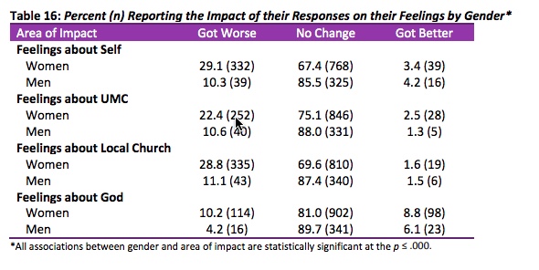 Some of the impacts were quite different, based on gender, as seen in Table 16. In each case, women were more likely than men to report that their feelings about self, church and God got worse.