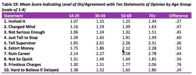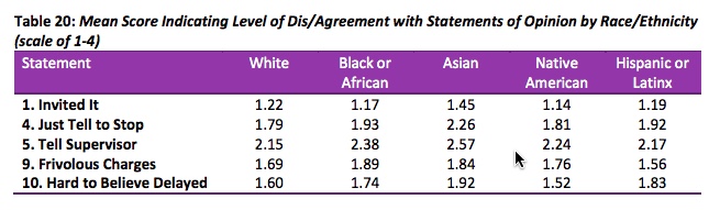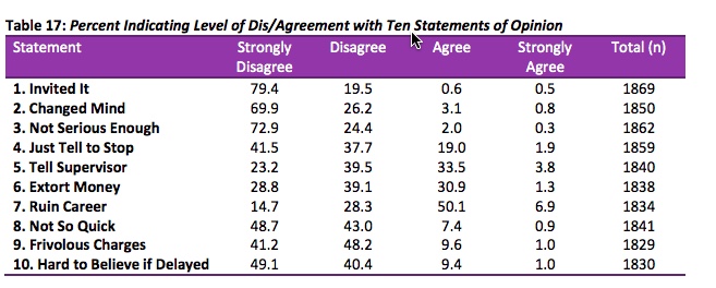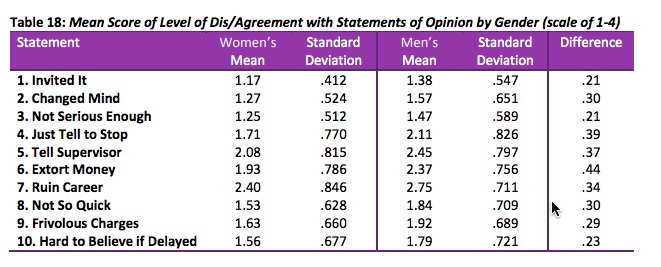 Note that both men and women indicate the strongest agreement with the statement about complainants using their accusations to extort money, but men’s agreement is stronger than women’s, achieving the only mean higher than the midpoint of 2.5. That is, on average, men agree with that statement more than they disagree. The least agreement is with the statements about inviting the attention and behavior not serious enough to report, but women disagree more strongly than men do. In fact, women’s agreement is lower for every statement.