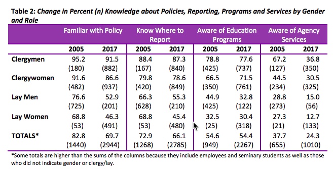The first section of each survey administered since 1990 focused on knowledge. In 1990, the lead questions were about the definition of sexual misconduct. Respondents were asked to define the term and indicate examples of problematic behaviors. By the next survey in 2005, it was assumed that people knew what sexual misconduct was, so a definition was provided and respondents were asked if they knew about the denomination’s response to it. That model was repeated in this study to track change over time.