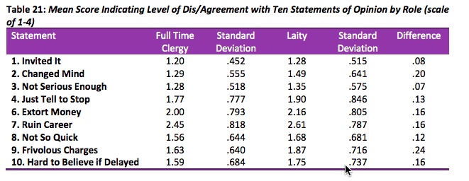 Asian and Asian American respondents were most likely to agree with four of the statements, all except the one about frivolous charges, which was most affirmed by black and African respondents. Lowest agreement shows less of a pattern, twice by whites (# 4 and #5), twice by Native Americans (#1 and 10) and once by Hispanics (#9), though the differences are all fairly small. Differences by role when comparing only full time clergy and laity are statistically significant (p ≤ .05) for nine of the statements, as seen in Table 21. For every statement, laity agree a bit more than clergy, although most differences are small. The biggest difference is concerning their opinions on whether people file frivolous charges.