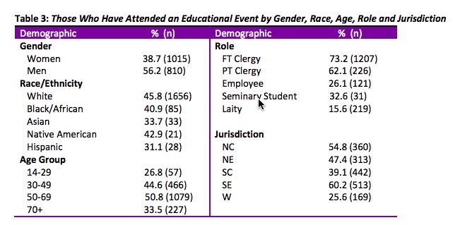 Table 2 shows the changes in the percentage of clergy and laity who know about United Methodist policies, where to report an incident, educational programs, and agency services for victims. Knowledge about policies, where to report and agency services has declined for men and women, clergy and lay, and in many cases, the decline is quite large. In addition, in 2017 only, a box was provided for people to write in the name of the agency they know, but 288 people didn’t write anything at all, and a few were incorrect, such as “I’d call GCORR (the General Commission on Religion and Race) and ask” or “local law enforcement.” Others were vague, such as “I would call the DS (District Superintendent) to find out” or “I’d have to look but I would know how to start.” In other words, it is likely that awareness of agency services is lower than indicated. The only increase over the last 12 years is regarding clergywomen’s awareness of educational programs. Fewer than half (44.9%, n = 1842) of all respondents reported having attended an educational event, although such attendance varies based on gender, role, and Jurisdiction, as seen in Table 3. Men, whites, those aged 50-69, clergy and those from the Southeastern Jurisdiction are most likely to have attended 4 such events, and women, Hispanics, the youngest respondents, laity, and those from the Western Jurisdiction are least likely to have attended one.