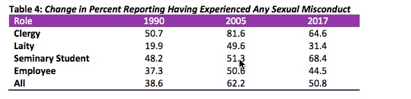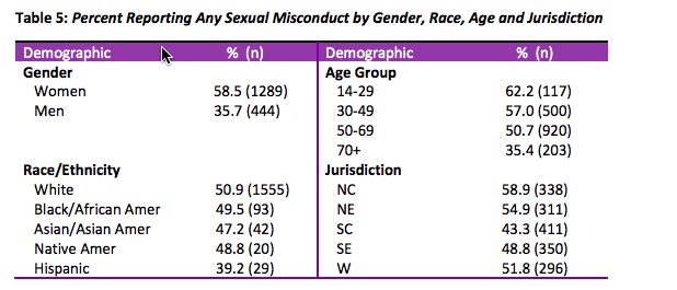 Table 5 displays the rates of sexual misconduct experience reported in 2017 only, by demographic group. Women, whites, and young respondents were the most likely to report such experiences. Those from the two southern Jurisdictions were least likely to report experiences of sexual misconduct.