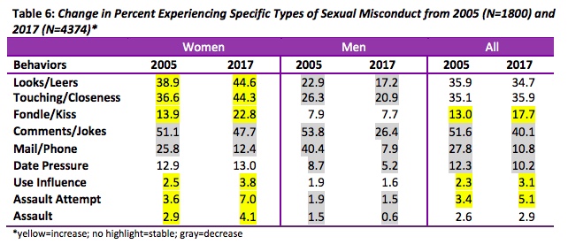 Sexual misconduct experiences were then broken down into type, as seen in Table 6, listed in the order asked in the 2017 survey. In 2005, men reported experiencing more inappropriate comments/teasing/jokes and mails/calls, but in 2017, all types were more commonly experienced by women respondents. It is hard to know what might be going on over time, as some types remained quite stable (not highlighted), some increased (yellow) and some decreased (gray). Neither data set represents a random sample, so any change may be simply due to chance, but if either study is representative, it is more likely the 2017 data because of the larger number of respondents (1800 in 2005 compared to 4374 in 2017). Overall though, change over time depends on the specific behavior, but it also appears that men are experiencing less sexual misconduct, and women are experiencing more. That, or as we may be seeing in the popular media, women are more likely to recognize and/or report it as such.