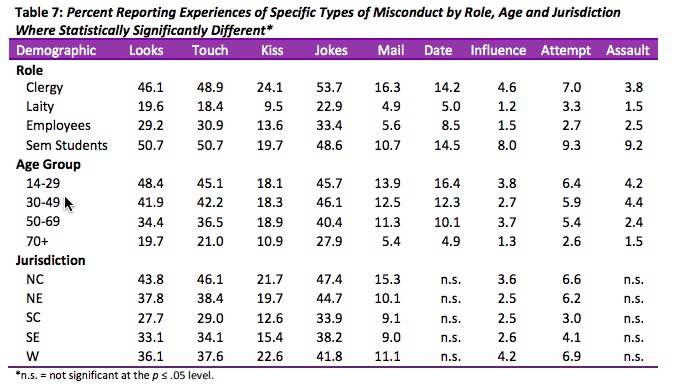 These behaviors also differed based on role, age group, and Jurisdiction, as seen in Table 7. Pressure for dates and completed assaults were not associated with Jurisdiction, but for all other behaviors, the associations with grouping variables are statistically significant at p ≤ .05. Overall, clergy are more at risk to experience all behaviors than laity, and younger persons report misconduct more than older groups. In fact, as age increases, reported experiences decrease. Patterns are less clear in the Jurisdictions, but 6 the North Central and Western Jurisdiction participants reported more misconduct, depending on specific behavior, than respondents from the other three regions.