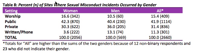 The most commonly reported site for incidents were public settings (41.9%) such as meetings, classes or events. Private settings, such as offices, homes and hotel rooms were the second most common settings (31.4%). More rarely, incidents occurred during worship (15.4%), in written/online documents or over the phone (11.3%), although these rates differed by the gender of the respondent, as seen in Table 8