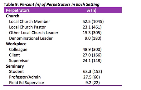 Interestingly, the most common perpetrator in each setting is not a person of great power, at least as traditionally defined. Certainly, in the workplace and school, colleagues and fellow students are not more powerful than others in those locations, but the local church is different. A member COULD be powerful, if a long time member or a generous giver, for example. Like clients in a workplace, it is difficult to tell a “customer” that they have sexually harassed you, for fear they will leave and take their business elsewhere. The breakdown of perpetrators by site of the incident is shown in Table 9.
