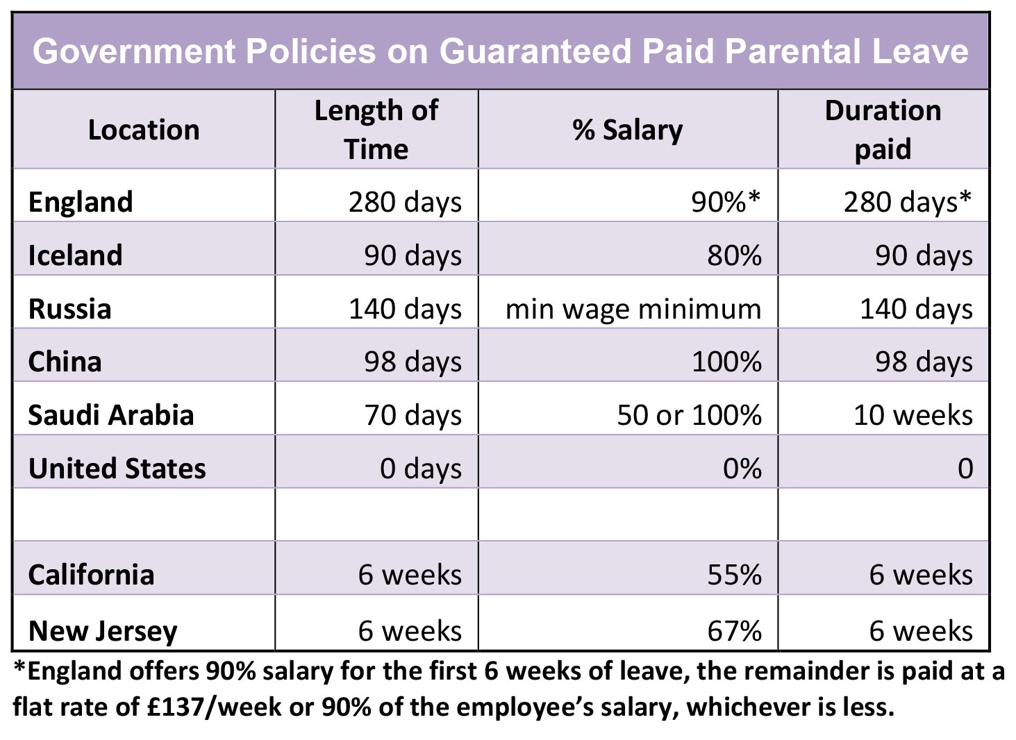Before California FLP and New Jersey FLI were instated, many employers had concerns about the effect parental leave would have on their businesses, suggesting it would be too costly and could impede on profits and productivity. A study on the effects of these policies, released six years later, found that these concerns were unfounded and in fact many businesses saved money because they didn’t have to train new hires or pay other employee turnover costs. In addition, providing paid family leave lengthened the amount of time men took to stay at home with a new child as well as the amount of time a woman chose to breastfeed her new child (page 29).
