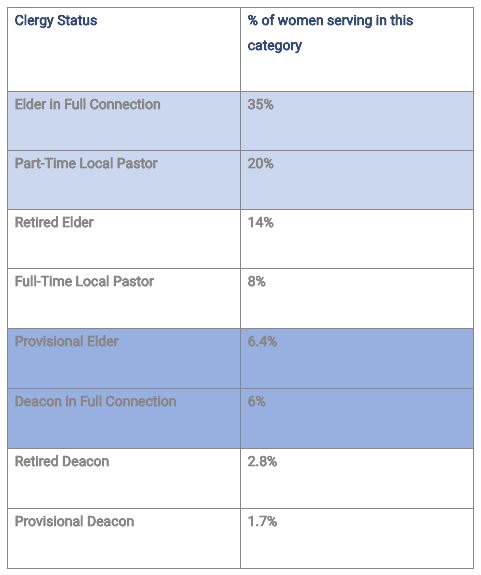 The largest number of clergymen are retired elders at 87%, with full-time local pastors (72%) and elders in full connection (71%) a close second and almost equal in number. There are more active women elders (29%) than retired elders (13%), the highest number of active female elders in history.