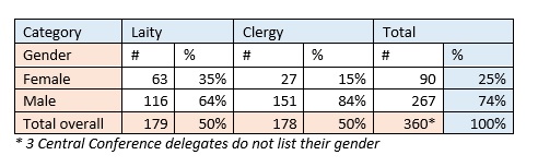 - Of the 360 Central Conference delegates, 267 (74%) are male and 90 (25%) are female, with 3 delegates not listing a gender.