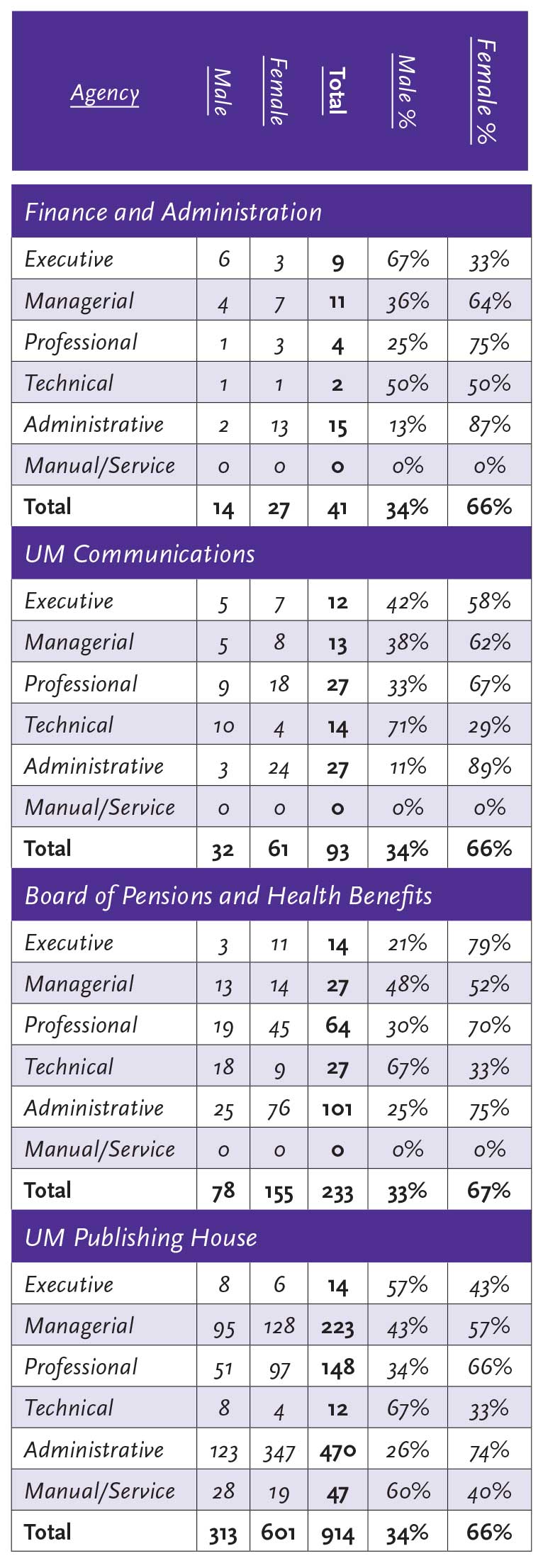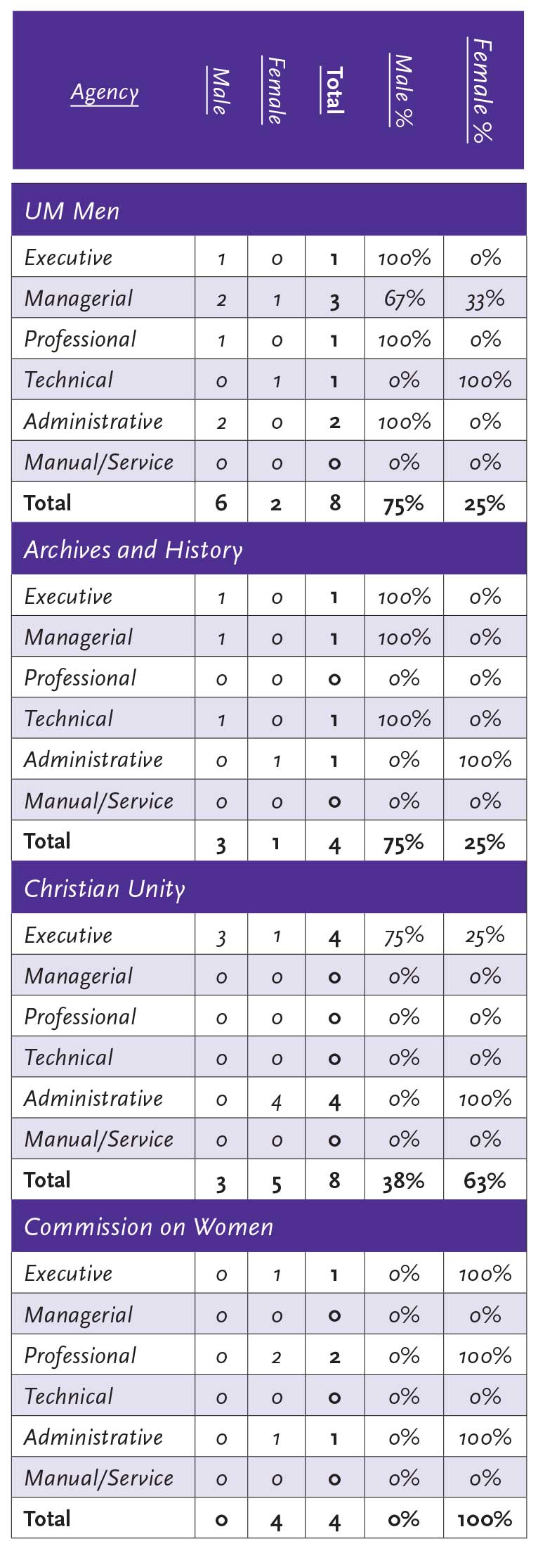 The Commission on Men and the Commission on Women are each charged by General Conference to focus on a specific ministry of men and women, respectively, in the church. As a result, 75% of the UMM workforce is male and 100% of the GCSRW workforce is female. That is to be expected.