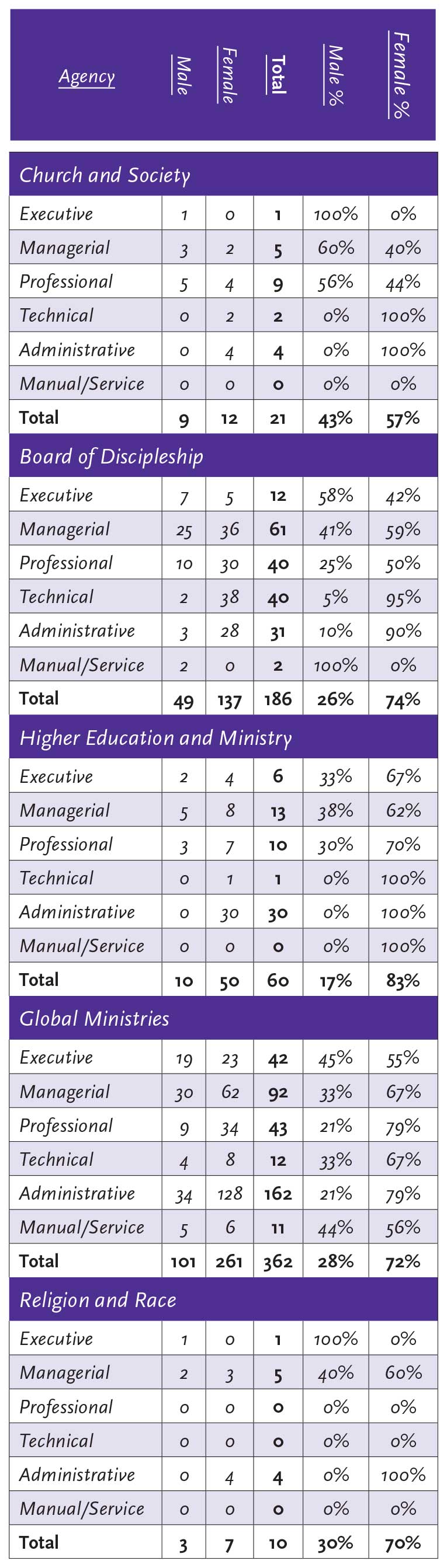Of the four general program boards of The United Methodist Church, women occupy a majority of the positions. The General Board of Higher Education and Ministry has 83% women in its workforce. The General Board of Global Ministries employs women as 72% of its workforce. The General Board of Church and Society employs women as 57% of its workforce (see Table 2). The General Board of Discipleship—the only general program board which is led by a female general secretary—employs women as 74% of its workforce.