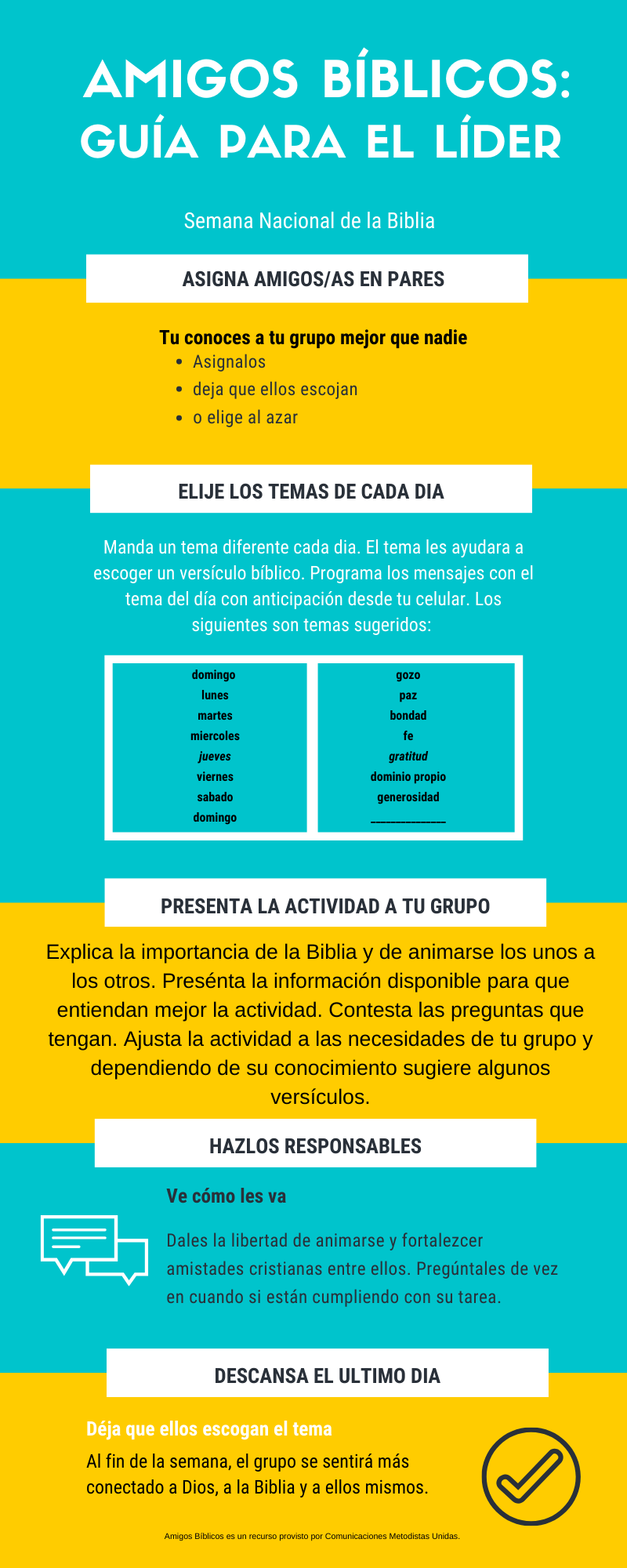 La actividad requiere pares de “Amigos Bíblicos". (Si la cuenta del grupo es un número impar, asigna tres personas a un grupo.) Cada día, los Amigos Bíblicos se enviarán versículos bíblicos basados en un tema indicado por el líder junto con una frase explicando porque eligieron ese versículo.