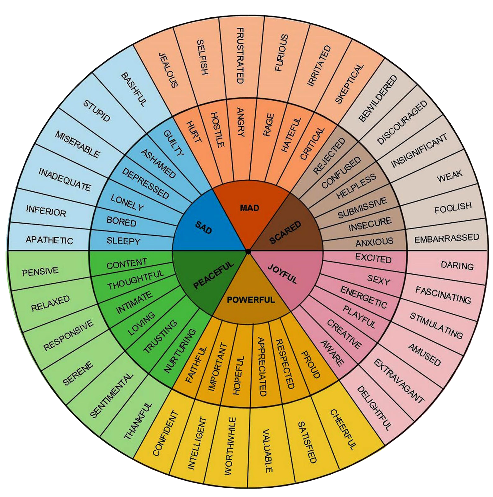 - Discutan lo que vieron en el video y cómo se sintieron. [Use la “rueda de emociones” como ayuda]. Dele tiempo a los presentes para que procesen lo que vieron. Esto puede incluir el silencio, el dolor abierto, el compartir entre dos personas y otros métodos que se acomoden al grupo.