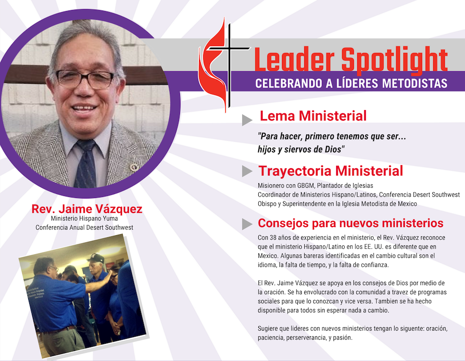 El Revdo. Jaime Vázquez, llegó a los Estados Unidos el 2011 de México para servir como misionero y coordinador de Ministerios Hispanos en la Conferencia Desert Southwest, por nombramiento de la Junta General de Ministerios Globales. Aunque partes del sistema y la cultura “americana”, o estadounidense, sean nuevas para él, lo que no es nuevo para el Revdo. Vázquez es la práctica estratégica de buscar el consejo de Dios en todo.