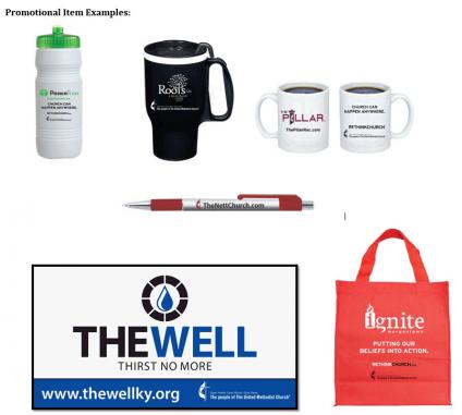 Todos los artículos se pueden personalizar con el nombre de su iglesia, el logotipo de su iglesia y el sitio web de su iglesia (su URL de Facebook o de "Find-A-Church" se puede utilizar si aún no tiene una página web). Algunos de los artículos más grandes pueden mostrar el eslogan de su iglesia si se ajusta a las especificaciones del artículo. También puede elegir el color que desee para que coincida con la identidad de su iglesia (dependiendo de los colores que estén disponibles para un artículo).